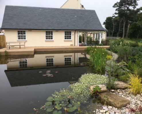A pond built in Gamekeeper Road, Edinburgh with a overhanging rustic deck.